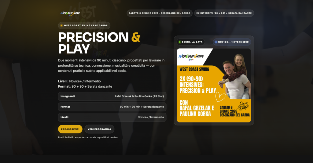 Due giornate di workshop con focus sul groove nel West Coast Swing: musicalità, tecnica e qualità del movimento. Two days of workshops focused on groove in West Coast Swing: musicality, technique, and movement quality.